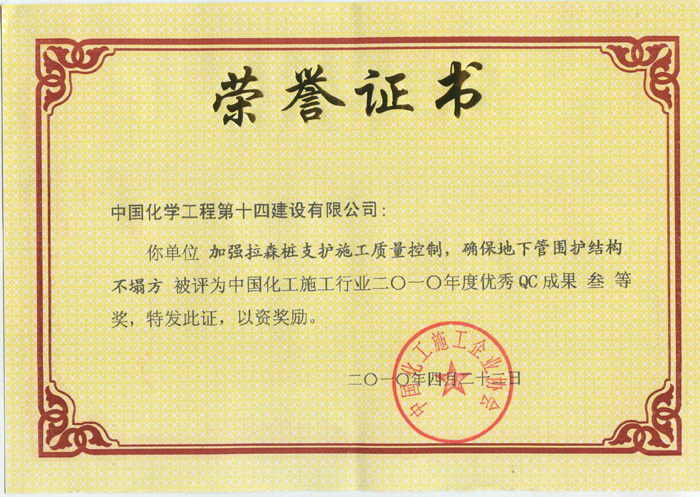 中國化工施工行業(yè)2010年度優(yōu)秀QC成果三等獎-中國化學(xué)工程第十四建設有限公司