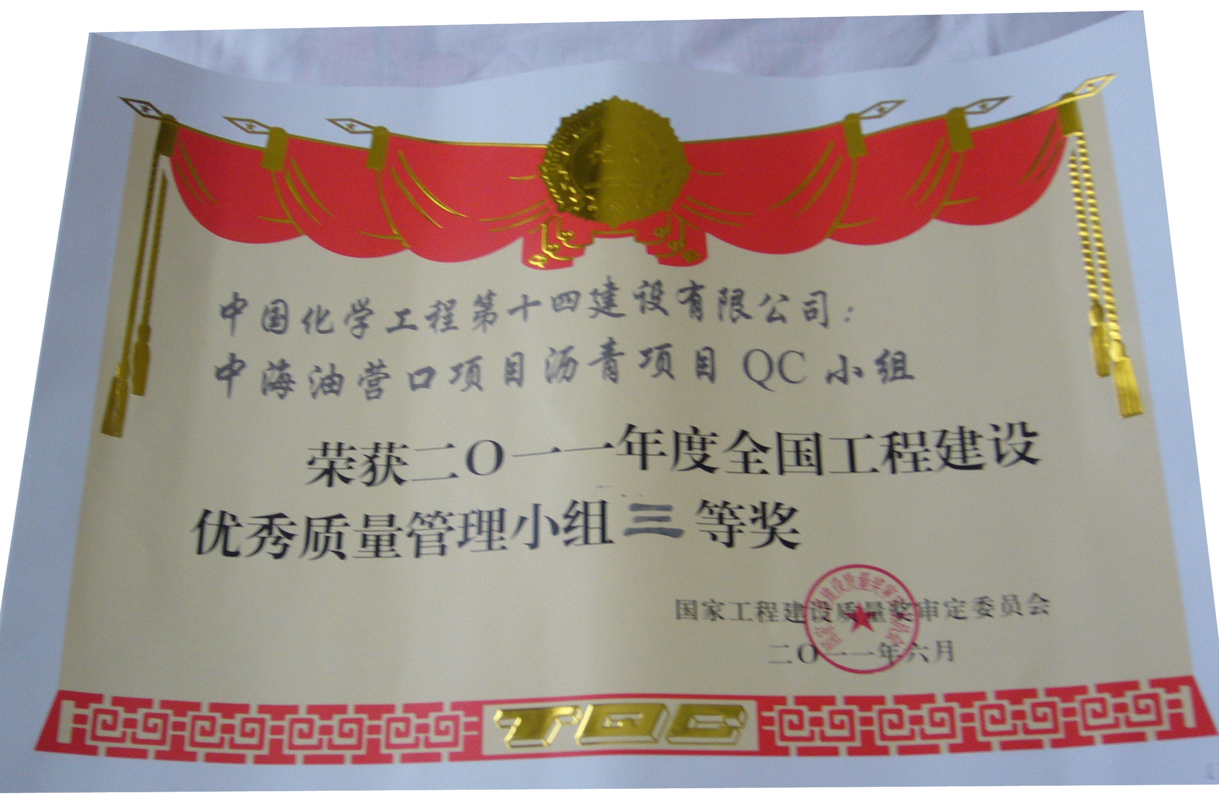 2011年度全國工程建設優(yōu)秀質(zhì)量管理小組三等獎-中國化學(xué)工程第十四建設有限公司