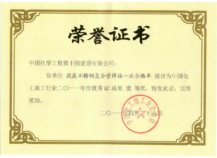 中國化工施工行業(yè)2011年度優(yōu)秀QC成果一等獎-中國化學(xué)工程第十四建設有限公司