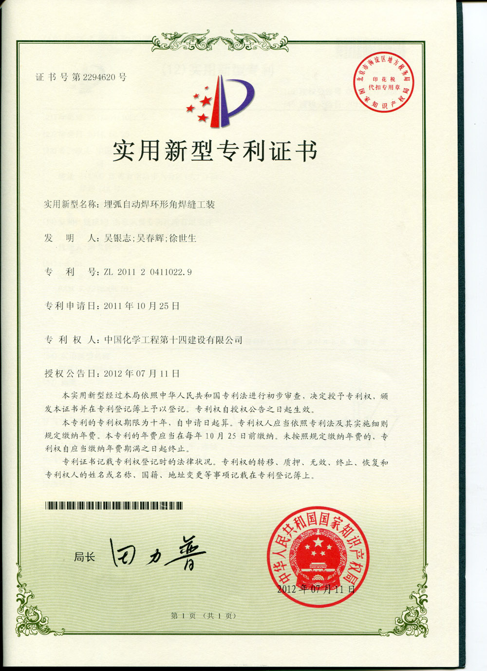 實(shí)用新型專(zhuān)利證書(shū)---埋弧自動(dòng)焊環(huán)形角焊縫工裝-中國化學(xué)工程第十四建設有限公司