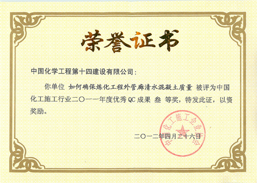 中國化工施工行業(yè)2011年度優(yōu)秀QC成果三等獎-中國化學(xué)工程第十四建設有限公司