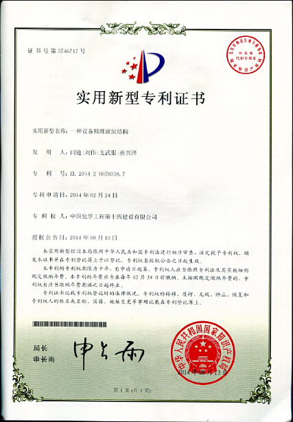 實(shí)用新型專(zhuān)利證書(shū)--一種設備精準就位結構-中國化學(xué)工程第十四建設有限公司