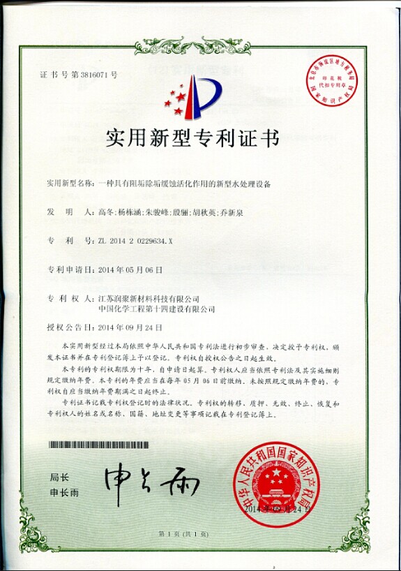 實(shí)用新型專(zhuān)利證書(shū)--一種具有阻垢除垢緩蝕活化作用的新型水處理設備-中國化學(xué)工程第十四建設有限公司
