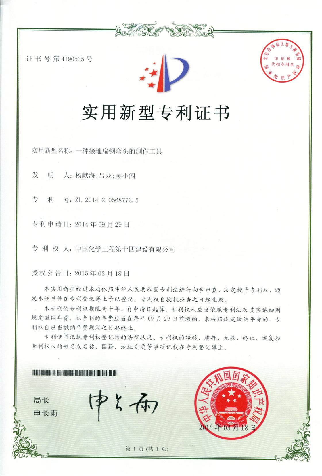 實(shí)用新型專(zhuān)利證書(shū)——一種接地扁鋼彎頭的制作工具-中國化學(xué)工程第十四建設有限公司