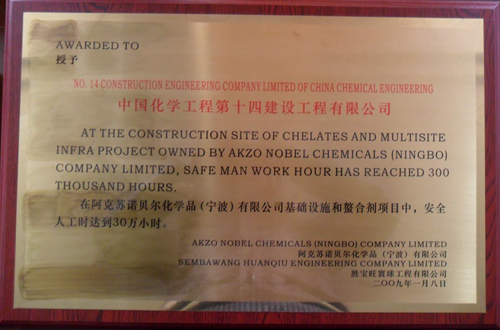 安全人工時(shí)30萬(wàn)小時(shí)(阿克蘇諾貝爾基礎設施和螯合劑項目)-中國化學(xué)工程第十四建設有限公司