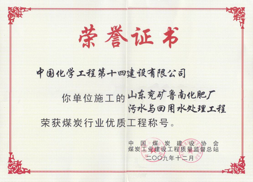 煤炭行業(yè)優(yōu)質(zhì)工程(山東兗礦魯南化肥廠(chǎng)污水與回用水處理工程)-中國化學(xué)工程第十四建設有限公司