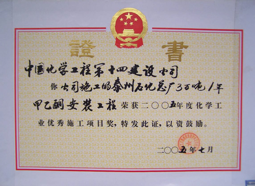 化學(xué)工業(yè)優(yōu)秀施工項目獎(泰州石化甲乙酮)-中國化學(xué)工程第十四建設有限公司