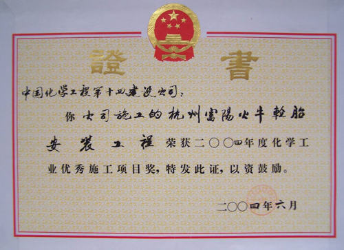 化學(xué)工業(yè)優(yōu)質(zhì)施工項目獎(杭州公牛輪胎)-中國化學(xué)工程第十四建設有限公司