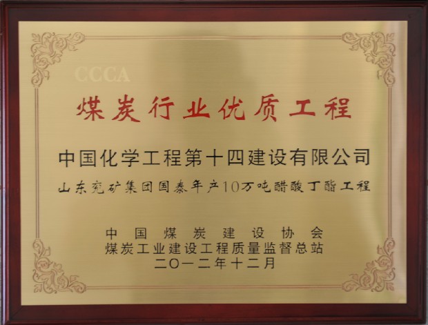 煤炭行業(yè)優(yōu)質(zhì)工程——山東兗礦集團國泰年產(chǎn)10萬(wàn)噸醋酸丁酯工程-中國化學(xué)工程第十四建設有限公司