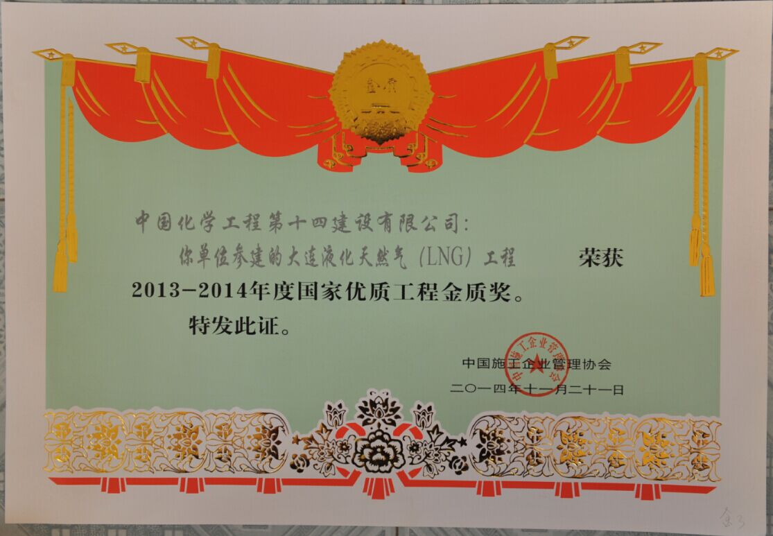 國家優(yōu)質(zhì)工程金質(zhì)獎(大連液化天然氣LNG工程)-中國化學(xué)工程第十四建設有限公司